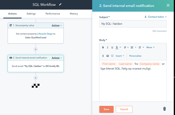 Det er simpelt at gøre. Du kan blot bygge videre på det ovenstående workflow og tilføje en intern email-notifikation til det. Her kan du tilføje informationer om kontakten, som skal med i den e-mail, som bliver sendt. På den måde kan du sikre, at dine salgsfolk får besked med det samme og får den mest nødvendige information up front. Det kan se således ud: