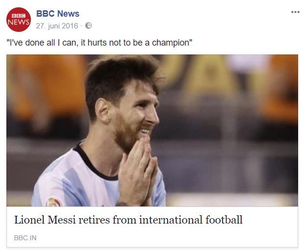 Test teksten på en eller flere af dine kollegaer, så du ved, om din tekst virker på andre. Og husk så også at holde din tekst så kort som muligt. Folk scroller lynhurtigt videre, hvis din tekst er for lang, så den dermed kræver for stor en indsats at afkode. Du kan eksempelvis tage et kort citat eller en del af et citat fra din video og bruge det som det skriftlige oplæg. I billedet herunder viser BBC på glimrende vis, hvordan dét kan gøres. Billedet leder her videre ind på en artikel, men fremgangsmåden er den samme, som hvis det havde været en video med Lionel Messi.