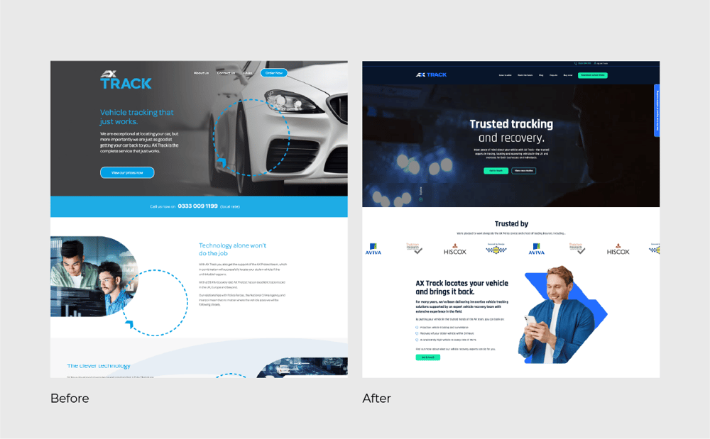 Wir arbeiteten mit AX Track zusammen, um eine neue visuelle Markenidentität zu entwickeln, indem wir die bestehende Marke weiterentwickelten und ein lebendigeres Farbschema einführten. Wir überarbeiteten auch den Chevron der Marke, um ihm ein moderneres Aussehen zu verleihen. Dieser wird nun auf der gesamten Website verwendet, um beispielsweise Bilder einzurahmen und die Aufmerksamkeit der Benutzer zu lenken.