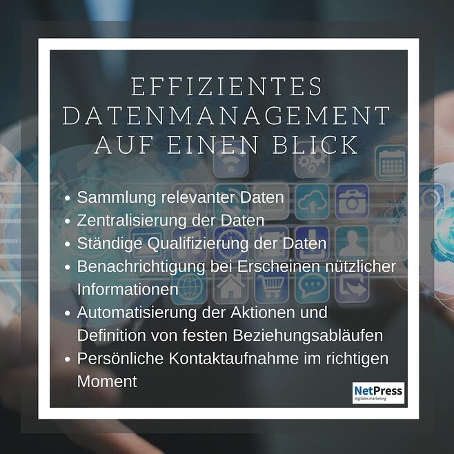 Gemeinsam mit Webmecanik und Ines CRM erstellte NetPress das E-Book „Datenmanagement und -synchronisierung – Der Schlüssel zum durchdachten Marketing“. Übersichtlich und verständlich beschreibt es zunächst, wie Daten im CRM richtig gesammelt und kategorisiert werden. Danach erfährt der Leser, wie mit Unterstützung von Marketingautomation eine sinnvolle Kundenansprache und -beziehung generiert wird.