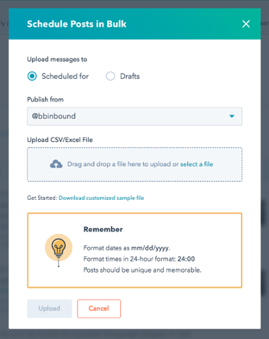Dersom du bruker Twitter i markedsføringen, har HubSpot en ekstra liten godbit til deg: Bulk scheduling. Ved å velge “Schedule in bulk” kan du altså på et øyeblikk legge klar tweets for resten av året, eller måneden, ved hjelp av en CSV- eller Excel-fil. HubSpot gir deg et tilpasset skjema og guider deg gjennom den enkle prosessen.